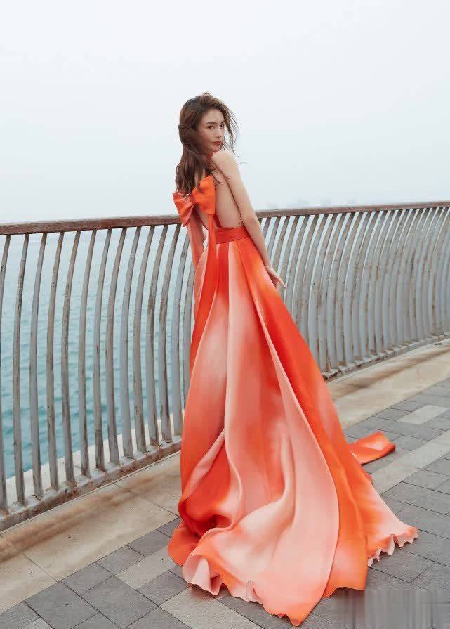 我们再来看下她们俩其他造型吧!金晨穿着这一款橘红色的晚礼服,尽显优雅大方的气质,看上去身材曼妙多姿,很显魅力。礼服采用了大露背的设计,装饰了一个蝴蝶结,设计感十足,凸显出优美的背部线条。